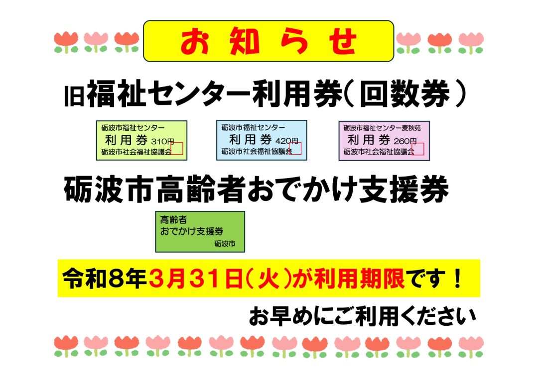 旧 福祉センター利用券(回数券)及び砺波市高齢者おでかけ支援券の利用期限は令和8年3月31日(火)です。利用期限が近づいておりますので、お早めにご利用ください。