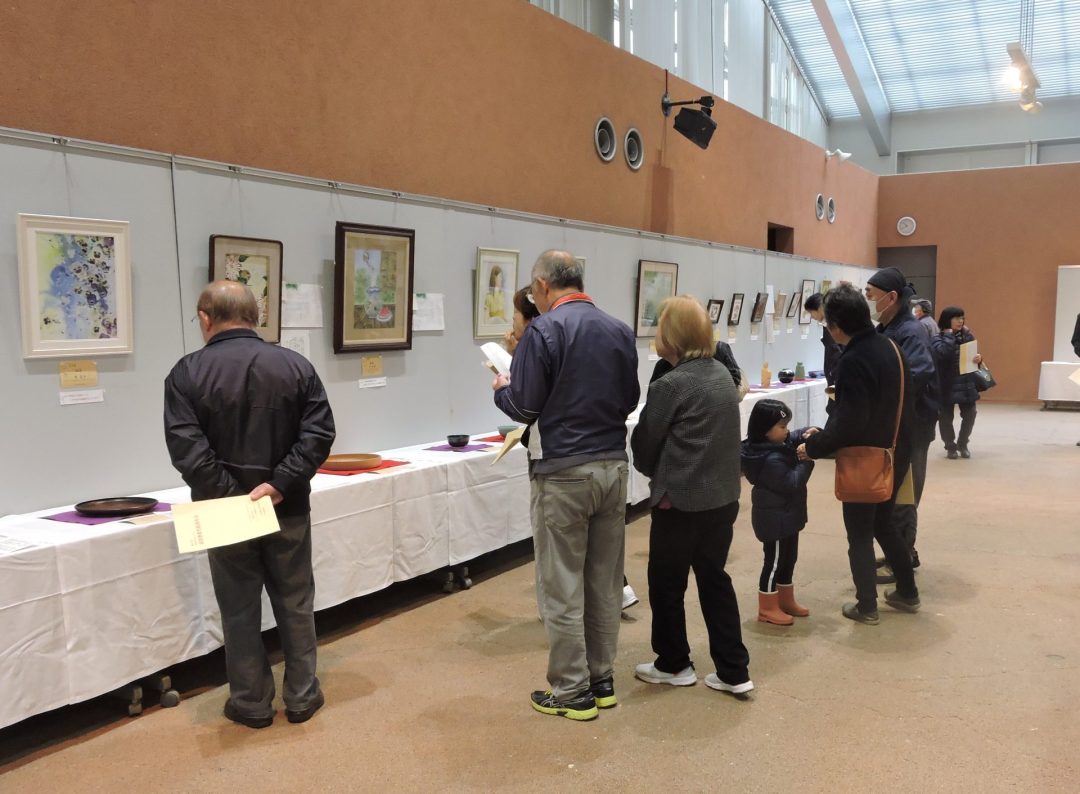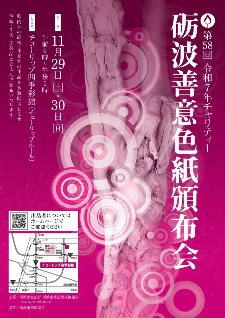 この頒布会は、砺波善意銀行と砺波市社会福祉協議会が、毎年11月に福祉事業の一環として行っています。市内外でご活躍中の作家の皆様や、京都・奈良などの有名寺社の高僧・宮司の方々にご寄贈いただいた、色紙・掛け軸・工芸などの作品を、来場されたお客様に入札という形でご購入いただき、その収益金は砺波市の地域福祉向上のための福祉事業に活用させていただきます。